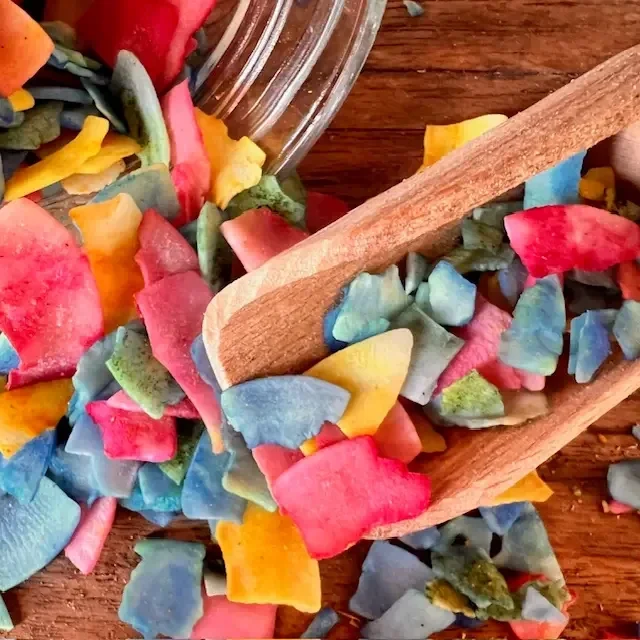 Gemaakt van kokosvlokken en aangevuld met rosemarijn, blauwe en groene spiruline, rode biet en kurkuma.