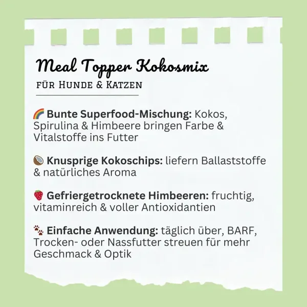 De combinatie van knapperige kokoschips, groene & blauwe spirulina en gevriesdroogde framboos maakt elk voer tot een echt hoogtepunt, zowel visueel als qua smaak. De ingrediënten leveren waardevolle voedingsstoffen: kokoschips bieden natuurlijke vezels, spirulina wordt beschouwd als een superfood met antioxidanten en eiwitten, en frambozen zorgen voor fruitige frisheid. 100% natuurlijk, vrij van kunstmatige toevoegingen, perfect voor kieskeurige honden en katten die iets bijzonders in de voerbak waarderen.