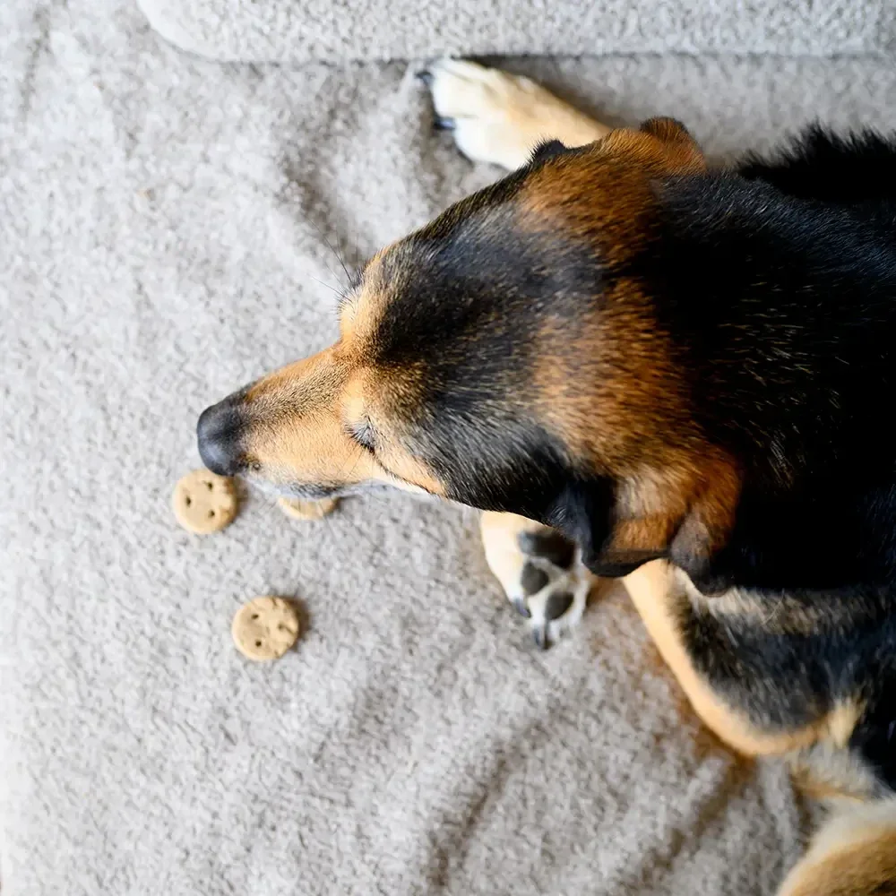 Daarvoor zijn deze Bedtime Cookies ideaal. L-tryptofaan, een essentieel aminozuur, kan de productie van serotonine ondersteunen en daarna melatonine - belangrijke hormonen voor ontspanning en een goede nachtrust. Daarnaast bevat het kamille, dat al eeuwenlang bekendstaat om zijn kalmerende werking. Dankzij de aardappelbasis wordt de koek ook bijzonder goed verdragen - perfect voor gevoelige honden en als snack vlak voor het slapengaan.